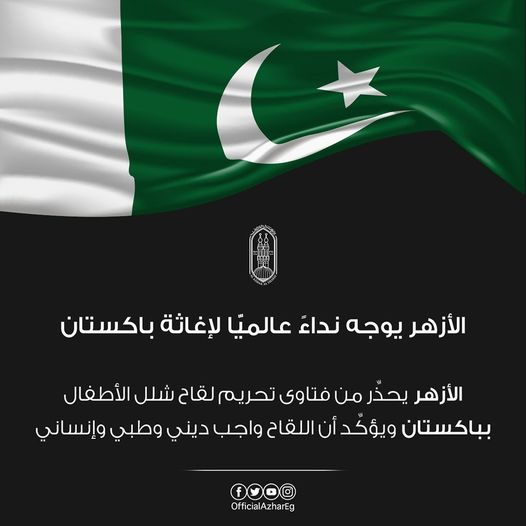 يدعو الأزهر الدول والشعوب والمؤسسات الإغاثية والخيرية حول العالم، للتضامن مع باكستان فيما تشهده من وضع كارثي بسبب السيول والفيضانات التي أودَتْ بحياة الآلاف، وشردت الأسر، وهدمت المنازل والمرافق الصحيَّة والاجتماعيَّة، وتسببت في أزمة نقص حادٍّ في الغذاء والدواء، وتفشي الأمراض الوبائيَّة.