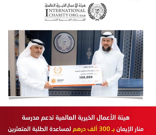 قدمت هيئة الأعمال الخيرية العالمية دعماً مادياً بقيمة 300 ألف درهم لمدرسة منار الإيمان الخيرية في إمارة عجمان، بهدف دعم الطلبة المتعثرين والمحتاجين.
