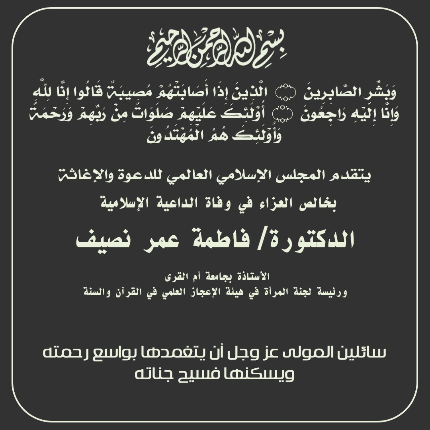 تنعي الأمانة العامة المجلس الإسلامي العالمي للدعوة والإغاثة، برئاسة فضيلة الأمين العام للمجلس، الأستاذ الدكتور/ عبد الله المصلح، ومدير المجلس، واللجان التابعة، وجميع رجال المجلس للأمة الإسلامية وفاة الداعية الإسلامية، ودرة زمانها في الدعوة، الدكتوره/ فاطمة عمر نصيف، التي أنشأت أجيالا من النساء الفاضلات العاملات في المجال الدعوي في السعودية والعالم العربي والإسلامي.