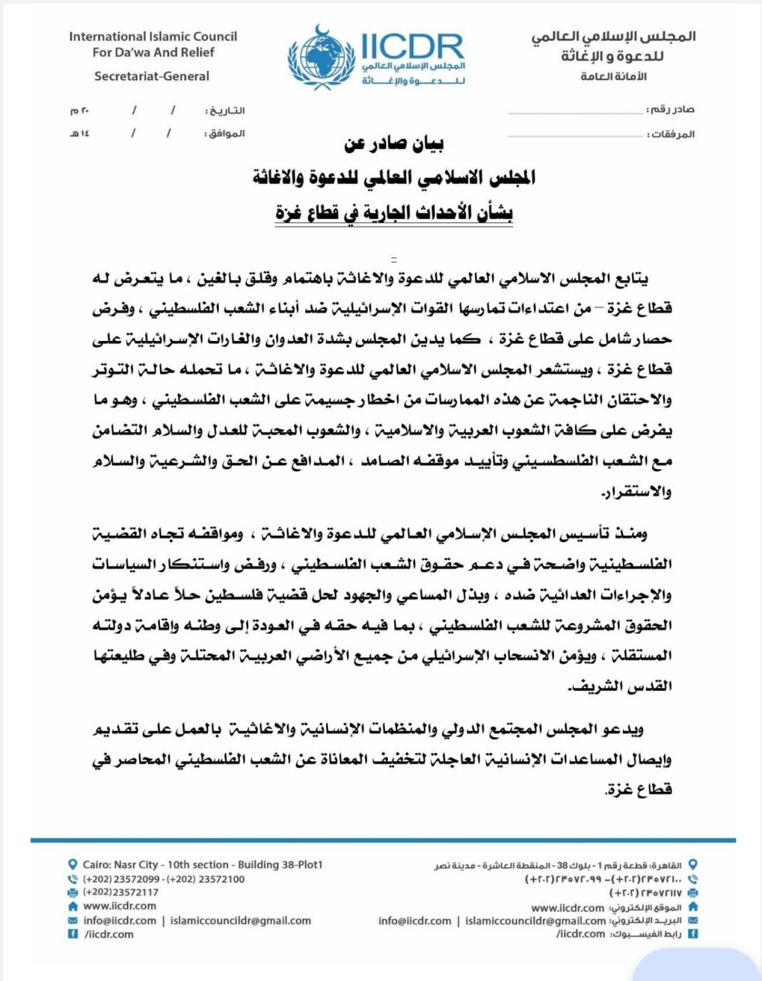 يتابع المجلس الإسلامي العالمي للدعوة والإغاثة باهتمام وقلق بالغين، ما يتعرض له قطاع غزة – من اعتداءات تمارسها القوات الإسرائيلية ضد أبناء الشعب الفلسطيني ، وفرض حصار شامل على قطاع غزة. كما يدين المجلس بشدة العدوان والغارات الإسرائيلية على قطاع غزة ، ويستشعر المجلس الإسلامي العالمي للدعوة والإغاثة ، ما تحمله حالة التوتر والاحتقان الناجمة عن هذه الممارسات من أخطار جسيمة على الشعب الفلسطيني ، وهو ما يفرض على كافة الشعوب العربية والإسلامية ، والشعوب المحبة للعدل والسلام التضامن مع الشعب الفلسطسيني وتأييد موقفه الصامد ، المدافع عن الحق والشرعية والسلام والاستقرار.