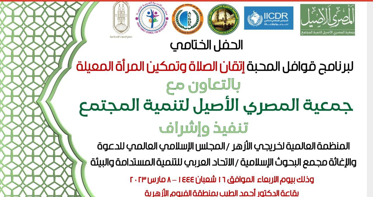في إطار الدور الدعوي الذي يقوم به المجلس الإسلامي العالمي للدعوة والإغاثة، ومشاركته الفعالة مع المجتمع المدني، اختتمت اللجنة الإسلامية العالمية للمرأة والطفل بالمجلس الإسلامي العالمي للدعوة والإغاثة فعاليات برنامج (قوافل المحبة – إتقان الصلاة وتمكين المرأة المعيلة)، وذلك بمشاركة المنظمة العالمية لخريجي الأزهر الشريف، وبالتعاون مع جمعية المصري الأصيل لتنمية المجتمع، وذلك في الفترة من 7 فبراير حتى 1 مارس 2023م.